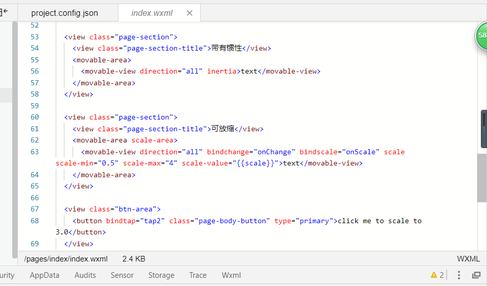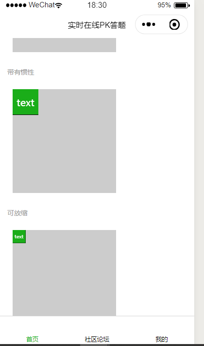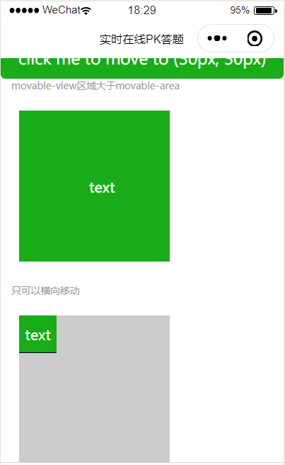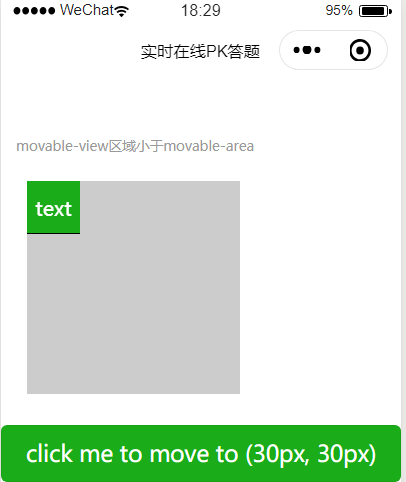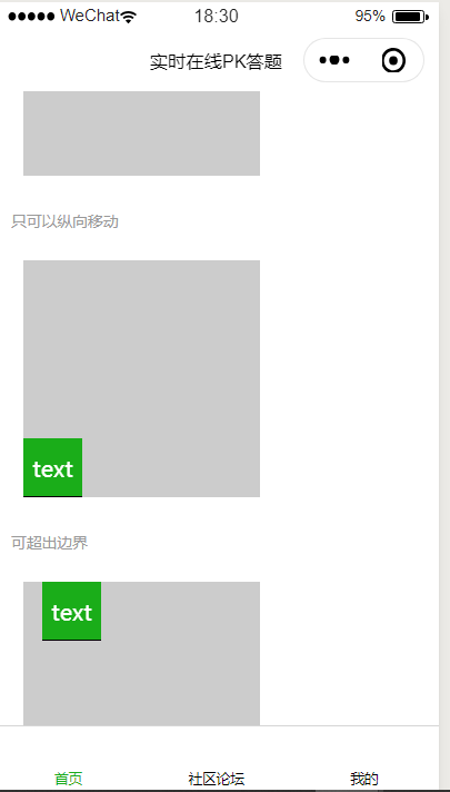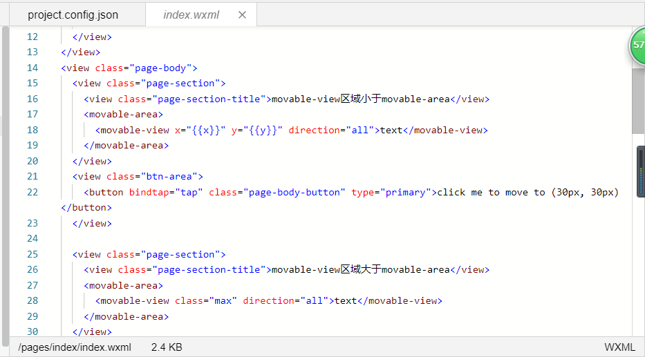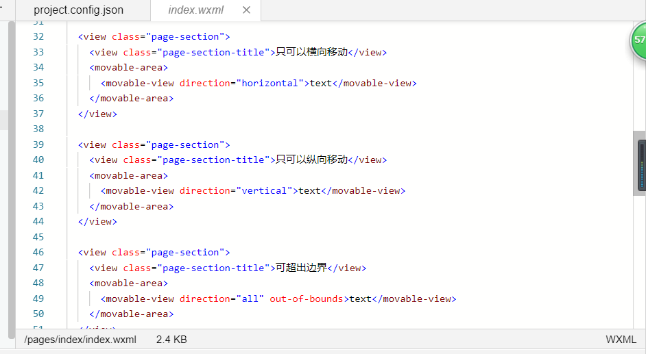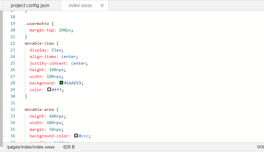 微信小程序movable-area 1.movable-view 是一个可移动的视图容器,在页面中可以拖拽滑动。 2. movable-view必须在 movable-area 组件中,并且必须是直接子节点,否则不能移动。 3. 实例代码如下: (1)将此代码添加至index.wxml中: (2)将此代码加至index.wxss中: 4.保存,效果如下图所示: 来源:51CTO作者:CHENxx_zw链接:https://blog.csdn.net/CHENxx_zw/article/details/100562976 标签 微信小程序 zw