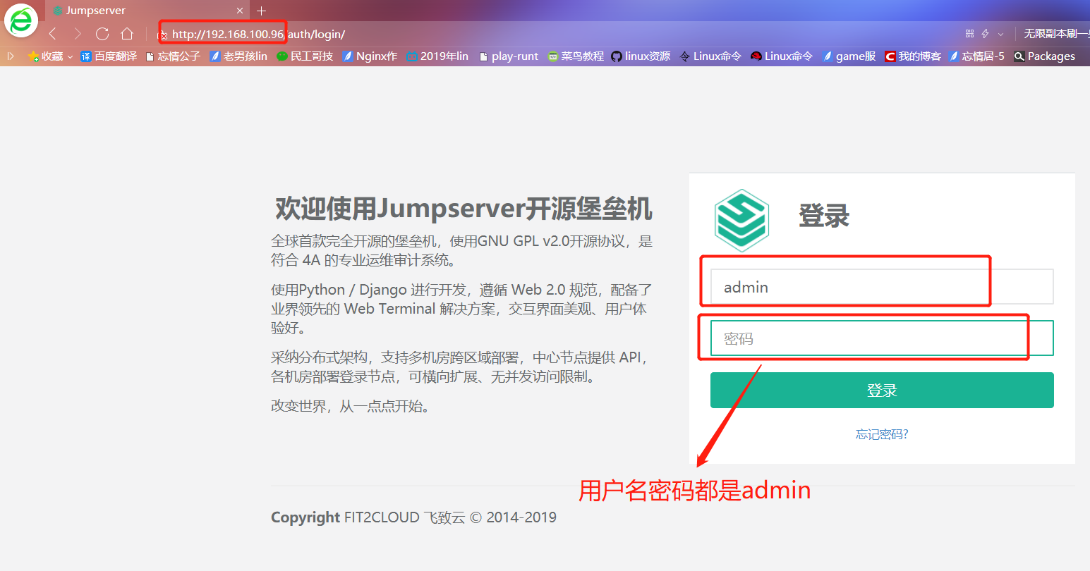 (py3) [root@localhost ~]# wget -O /usr/lib/systemd/system/jms.service https://demo.jumpserver.org/download/shell/centos/jms.service (py3) [root@localhost ~]# chmod 755 /usr/lib/systemd/system/jms.service (py3) [root@localhost ~]# systemctl enable jms 浏览器访问页面如下: