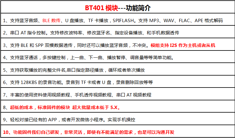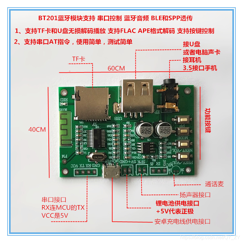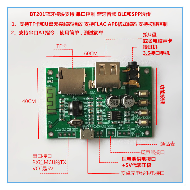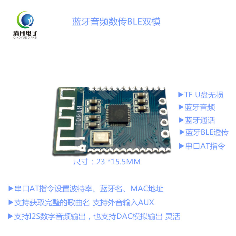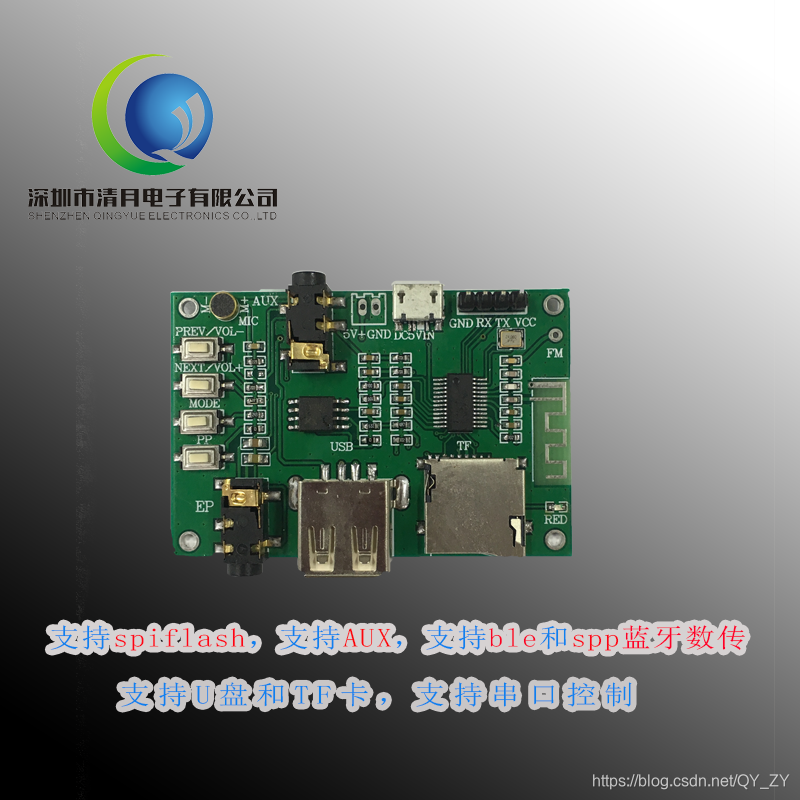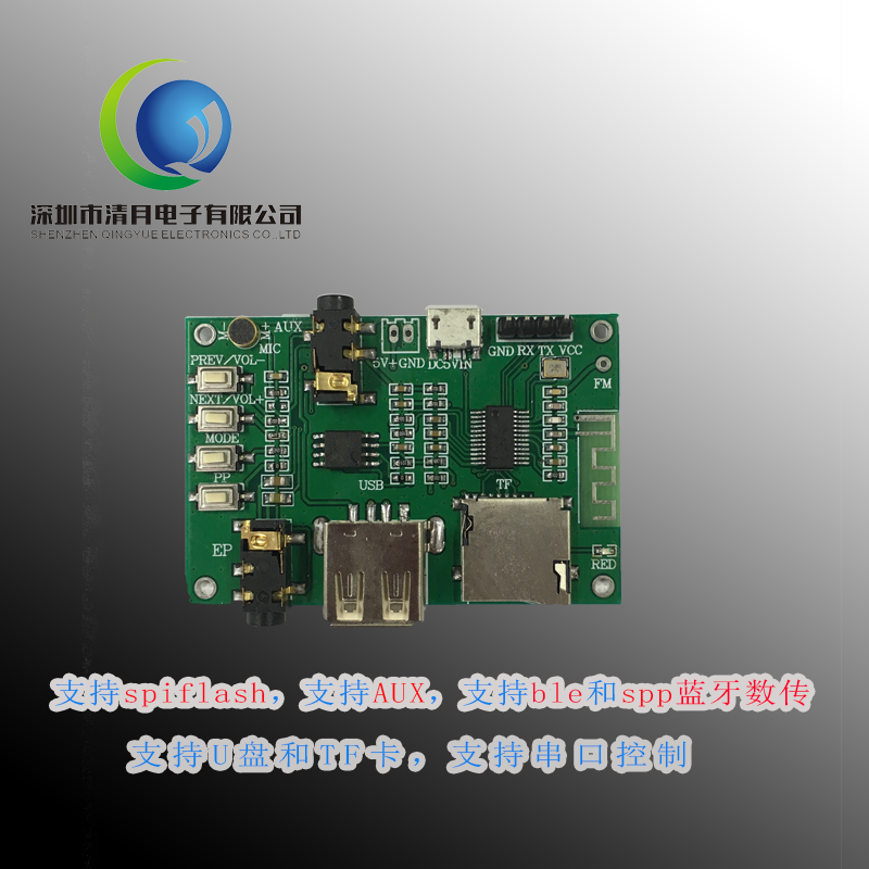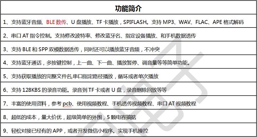 1、蓝牙音频播放、TF卡U盘无损播放、蓝牙双模。外挂spiflash语音播放。蓝牙I2S音频输出。串口AT指令控制