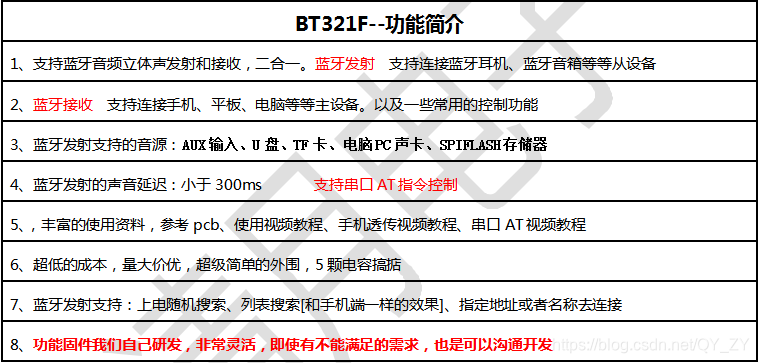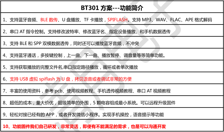 应用场景: 蓝牙数传+语音提示的类型产品 支持spiflash的播放 |