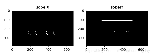 #用sobel算子计算梯度,分别求X,Y方向的梯度 sobelX = cv2.Sobel(img,cv2.CV_64F,1,0,ksize=3) sobelY = cv2.Sobel(img,cv2.CV_64F,0,1,ksize=3) #封装在plt中 plt.subplot(121) plt.imshow(sobelX) plt.title('sobelX') plt.subplot(122) plt.imshow(sobelY) plt.title('sobelY') #显示图片 plt.show() Result.1