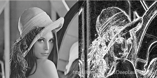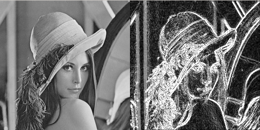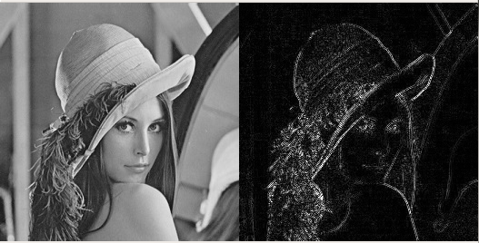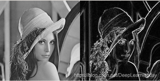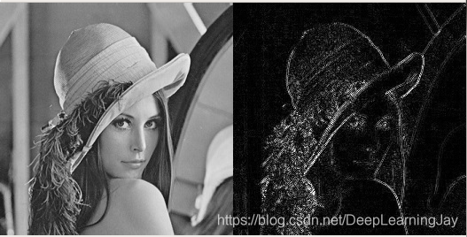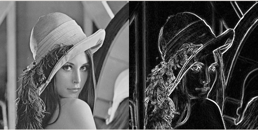#使用其他图片测试,导入 lena = cv2.imread('lena.jpg',cv2.IMREAD_GRAYSCALE) #分别计算sobelX和sobelY lena_sobelX = cv2.Sobel(lena,cv2.CV_64F,1,0,ksize=3) lena_sobelY = cv2.Sobel(lena,cv2.CV_64F,0,1,ksize=3) #将其中负值都绝对值化 lena_sobelX = cv2.convertScaleAbs(lena_sobelX) lena_sobelY = cv2.convertScaleAbs(lena_sobelY) #将sobelX,Y融合 lena_sobelXY = cv2.addWeighted(lena_sobelX,0.5,lena_sobelY,0.5,0) #显示图像 res = np.hstack((lena,lena_sobelXY)) cv_show('lenas',res) Result.4