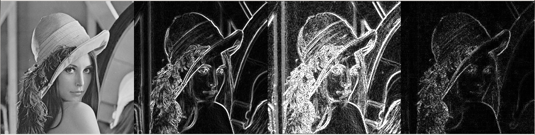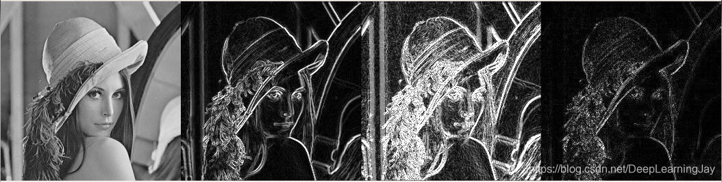#显示原图以及各种算子计算梯度的效果图 res = np.hstack((lena,lena_sobelXY,lena_scharrXY,lena_laplacian)) cv_show("all",res) Result.