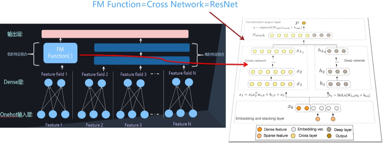 对于低阶的组合特征的构造,线性模型使用人工特征工程,FM使用隐向量的内积,FFM引入field的概念,针对不同的field上使用不同隐向量构造组合特征。DNN可以一定程度上实现自动学习特征组合,学习到的特征都是高度非线性的高阶组合特征,这样的隐式的学习特征组合带来的不可解释性,以及低效率的学习,因为并不是所有的特征组合都是有用的。Deep&Cross Network(DCN)将Wide部分替换为由特殊网络结构实现的Cross,在学习特定阶数组合特征的时候效率非常高,自动构造有限高阶的交叉特征,并学习对应权重,告别了繁琐的人工叉乘。