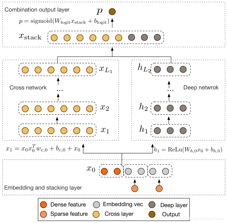 p是最终的预测概率;XL1是d维的,表示Cross Network的最终输出;hL2是m维的,表示Deep Network的最终输出;Wlogits是Combination Layer的权重;最后经过sigmoid函数,得到最终预测概率。
