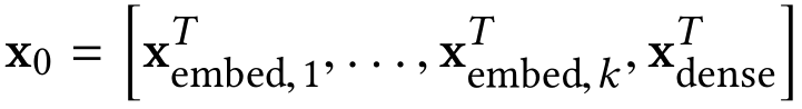 文中对原始特征做如下处理:1) 对sparse特征进行embedding,对于multi-hot的sparse特征,embedding之后再做一个简单的average pooling;2) 对dense特征归一化,然后和embedding特征拼接,作为随后Cross层与Deep层的共同输入,即: