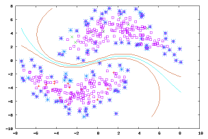 | 基于核的方法 | 支持向量机就是典型的代表,就是把输入数据映射到一个高阶的向量空间里,让一些分类和回归问题更容易解决![]() | 支持向量机,RBF,LDA(现象判别分析) |