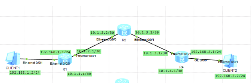 配置目标:如下拓扑结构,从CLIENT1去pingCLIENT2,ping通