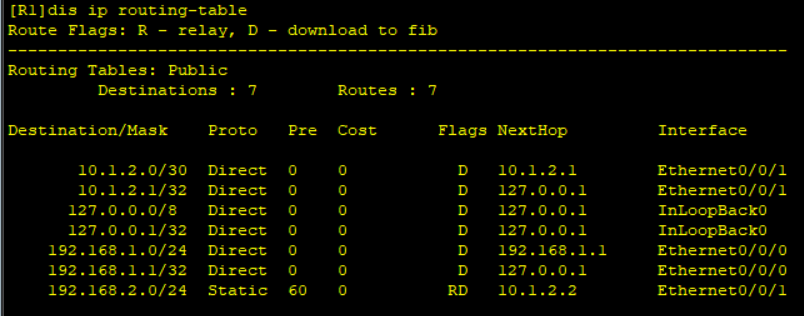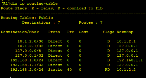 sys 进入R1路由 ip route-static 192.168.2.0 24(网络位) 10.1.2.2 dis ip routing-table 查看路由表是否存在静态路由
