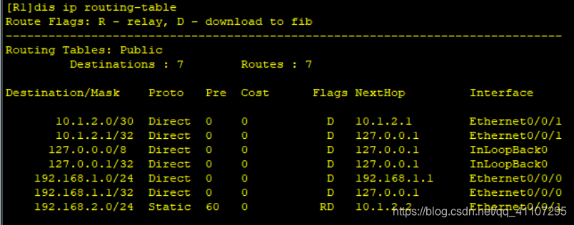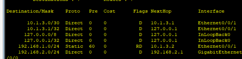 第一列就是网络号和子网掩码,是我们目标地址,第二列就是查看是否是静态路由,图中最后一个就是静态路由,其他位直连路由, 第六列就是下一跳地址,就是我们下一个通向的地址。