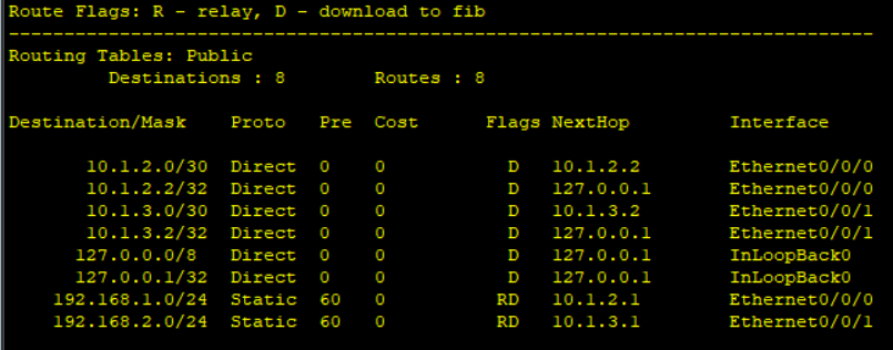 sys 进入R2路由 ip route-static 192.168.1.0 24(网络位) 10.1.2.1 dis ip routing-table 查看路由表是否存在静态路由 至此配置完毕,