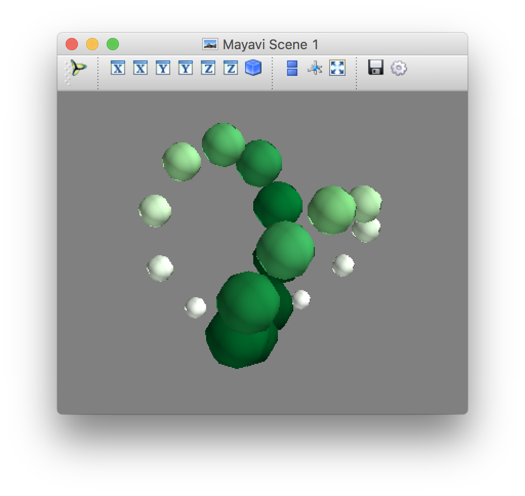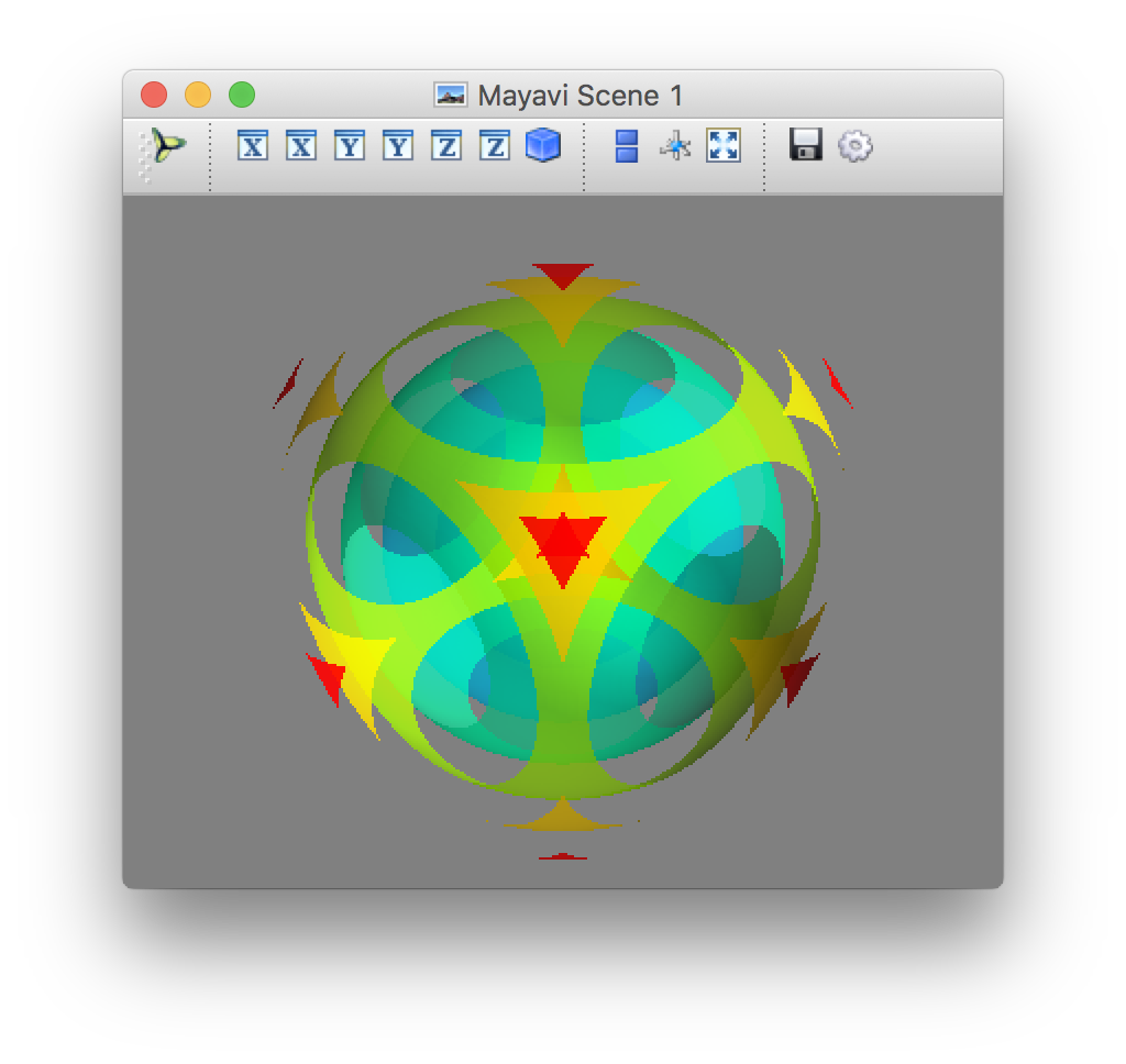 import numpy from mayavi import mlab x, y, z = numpy.ogrid[-5:5:64j, -5:5:64j, -5:5:64j] scalars = x * x + y * y + z * z obj = mlab.contour3d(scalars, contours=8, transparent=True) mlab.show() 运行结果