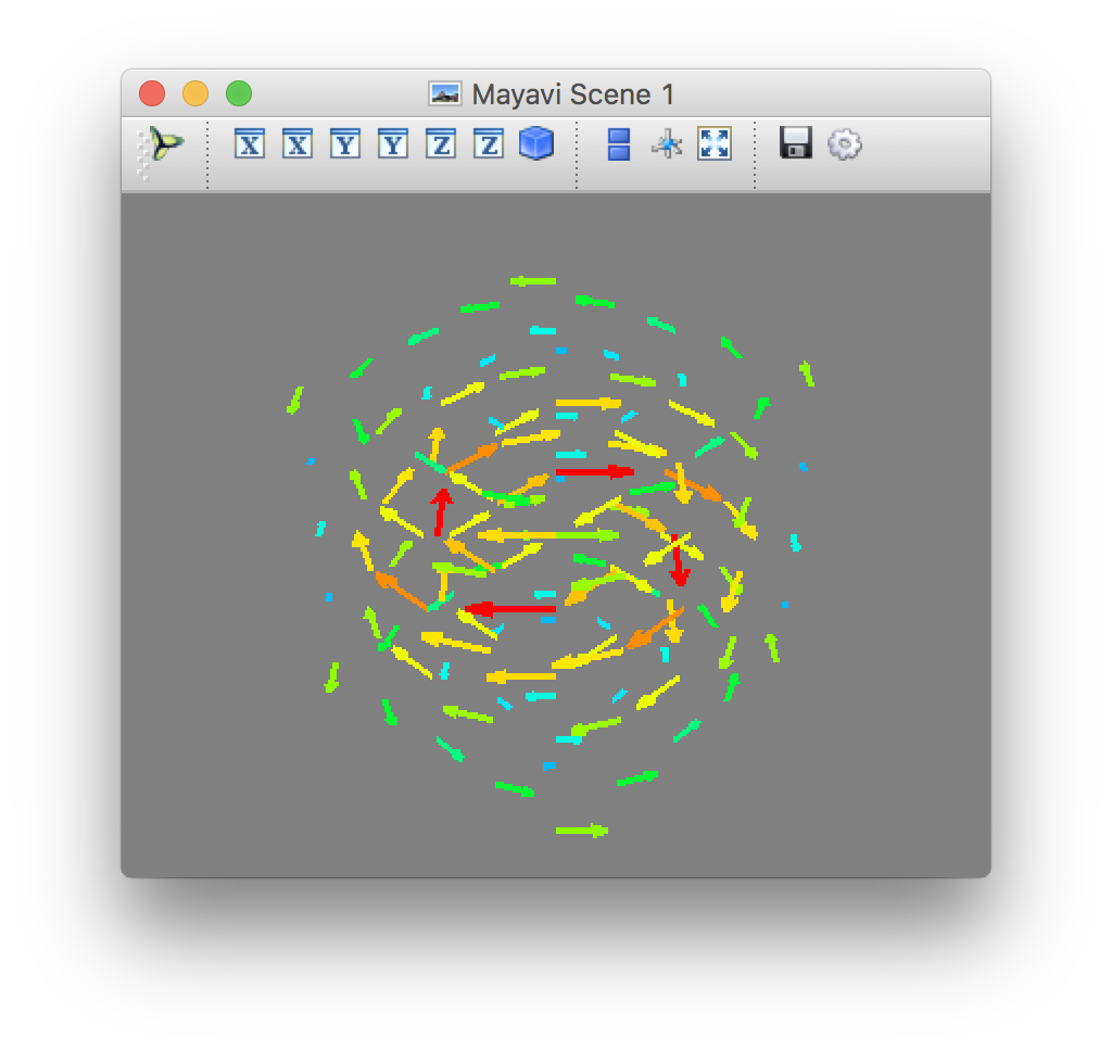 import numpy as np from mayavi import mlab x, y, z = np.mgrid[-2:3, -2:3, -2:3] r = np.sqrt(x ** 2 + y ** 2 + z ** 4) u = y * np.sin(r) / (r + 0.001) v = -x * np.sin(r) / (r + 0.001) w = np.zeros_like(z) obj = mlab.quiver3d(x, y, z, u, v, w, line_width=3, scale_factor=1) mlab.show() 运行结果