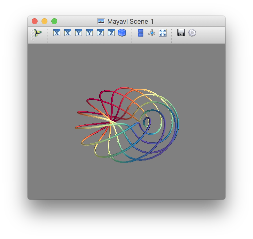 import numpy as np from mayavi import mlab # 建立数据 n_mer, n_long = 6, 11 dphi = np.pi / 1000.0 phi = np.arange(0.0, 2 * np.pi + 0.5 * dphi, dphi) mu = phi * n_mer x = np.cos(mu) * (1 + np.cos(n_long * mu / n_mer) * 0.5) y = np.sin(mu) * (1 + np.cos(n_long * mu / n_mer) * 0.5) z = np.sin(n_long * mu / n_mer) * 0.5 # 对数据进行可视化 l = mlab.plot3d(x, y, z, np.sin(mu), tube_radius=0.025, colormap='Spectral') mlab.show() 运行结果