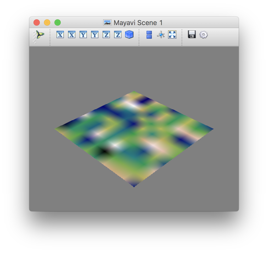 import numpy from mayavi import mlab # 建立数据 s = numpy.random.random((10, 10)) # 对数据进行可视化 img = mlab.imshow(s, colormap='gist_earth') mlab.show() 运行结果