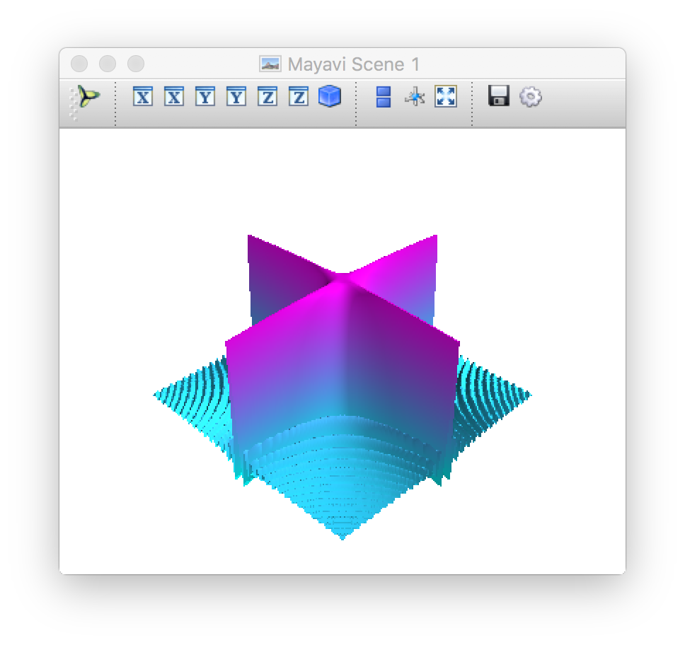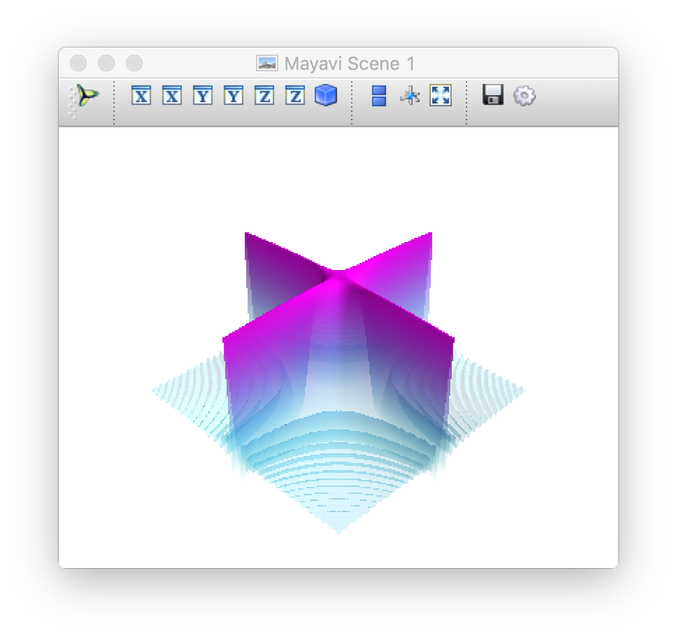 import numpy as np from mayavi import mlab #建立数据 x, y = np.mgrid[-10:10:200j, -10:10:200j] z = 100 * np.sin(x * y) / (x * y) # 对数据进行可视化 mlab.figure(bgcolor=(1, 1, 1)) surf = mlab.surf(z, colormap='cool') # 更新视图并显示出来 mlab.show() import numpy as np from mayavi import mlab # 建立数据 x, y = np.mgrid[-10:10:200j, -10:10:200j] z = 100 * np.sin(x * y) / (x * y) # 对数据进行可视化 mlab.figure(bgcolor=(1, 1, 1)) surf = mlab.surf(z, colormap='cool') # 访问surf对象的LUT # LUT是一个255*4的数组,列向量表示RGBA, # 每个值的范围从0-255 lut = surf.module_manager.scalar_lut_manager.lut.table.to_array() # 增加透明度,修改alpha通道 lut[:, -1] = np.linspace(0, 255, 256) surf.module_manager.scalar_lut_manager.lut.table = lut # 更新视图并显示出来 mlab.show() 运行结果