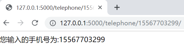 from flask import Flask, url_for from werkzeug.routing import BaseConverter class TelephoneConverter(BaseConverter): # 正则处表示第一位是1,第二位是中括号里的任意数字, # \d代表数字,9代表后续还有9位数字 regex = r'1[8573]\d{9}' app.url_map.converters['tel'] = TelephoneConverter @app.route('/telephone/<tel:m_tel>/') def my_tel(m_tel): return '您输入的手机号为:{}'.format(m_tel) 输出: