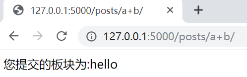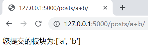 class ListConverter(BaseConverter): # 使用list类型的参数,通过to_python()方法可以将返回值传到视图函数中 # 即对URL规则进行操作,然后返回到视图函数中呈现出来 # value参数对应url规则中传入的参数值,即a+b def to_python(self, value): # 返回url规则中参数值的分割值 return value.split('+') # return 'hello' app.url_map.converters['list'] = ListConverter @app.route('/posts/<list:boards>/') def posts(boards): return '您提交的板块为:{}'.format(boards) 输出1: