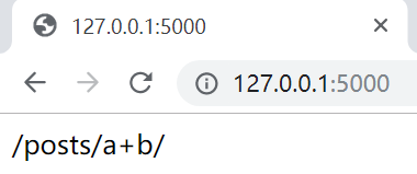 class ListConverter(BaseConverter): # 用在使用url_for函数返回URL规则时 # 使用to_url方法会将返回值传入URL规则内 # 即将返回值传入route装饰器中的URL规则中的参数部分 # value对应的是url反转函数中传入的参数 def to_url(self, value): return "+".join(value) # return 'hello' app.url_map.converters['list'] = ListConverter @app.route('/') def hello_world(): return url_for('posts', boards=['a', 'b']) 输出1: