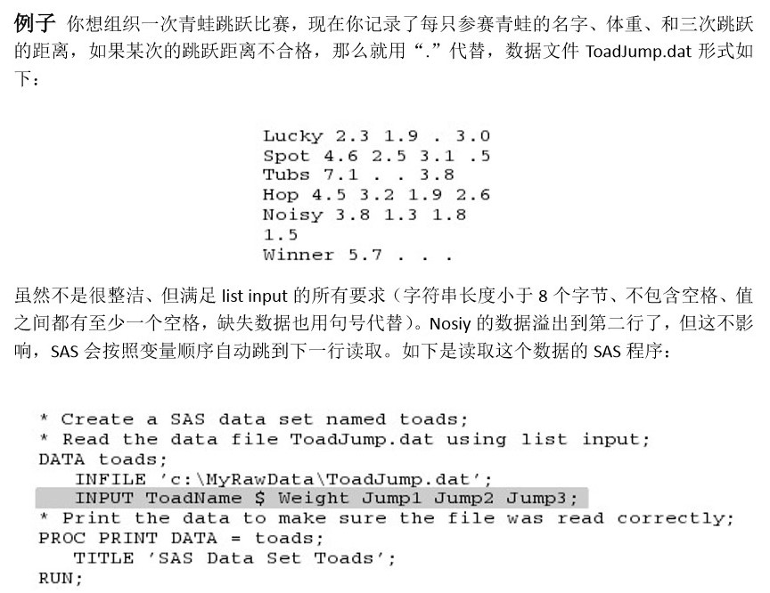 INPUT A $ 1-18 B $ C D YYMMDD11.; 这个语句中,A用的是column input,为在第1-18列的字符型数据;B用的是list input,为字符型数据;C用的是list input,为数值型数据;D用的是informats input,为宽度为11、格式为年月日的日期。