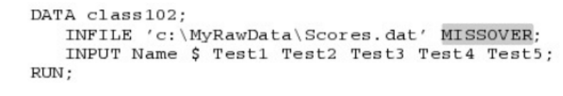 INFILE 'c:\Myrawdata\data.dat' FIRSTOBS=3 OBS=5; - 当需要将文件中未赋值的变量读取为缺失值时,在INFILE语句后用MISSOVER。(在 input 语句中输入的几个变量,SAS 在观测值中就读取几个变量,如果一行未读完,则进入下一行直到输入的变量都读取了变量值。)