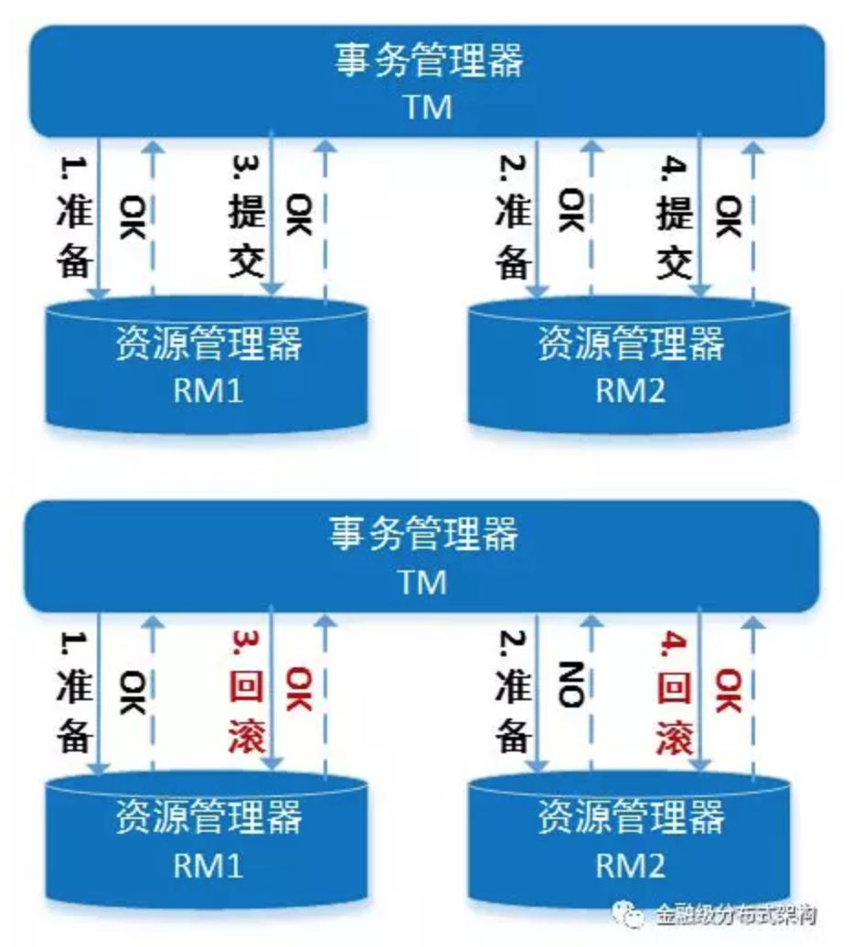 TM调用RM的xa_prepare()来进行第一阶段,调用xa_commit()或xa_rollback()执行第二阶段。