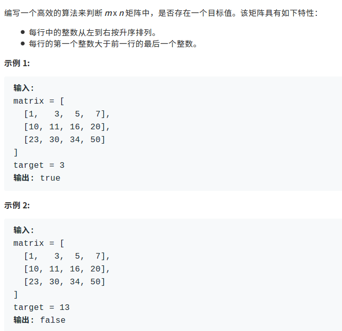 class Solution { public: vector<int> searchRange(vector<int>& nums, int target) { //for(int i = 0; i < 6; i++)printf("%d ",nums[i]);printf("\n"); vector<int> ret(2,-1); int size = nums.size(); if(size == 0) return ret; // find front int start = 0, end = size - 1; while(start+1 < end) { int mid = start + (end - start) / 2; //printf("start is %d, end is %d, mid is %d \n",start,end,mid); if(nums[mid] >= target) { end = mid; } else { start = mid; } } if(nums[start] == target) { ret[0] = start; } else if(nums[end] == target) { ret[0] = end; } //find back start = 0, end = size - 1; while(start+1 < end) { int mid = start + (end - start) / 2; //printf("start is %d, end is %d, mid is %d \n",start,end,mid); if(nums[mid] <= target) { start = mid; } else { end = mid; } } if(nums[end] == target) { ret[1] = end; } else if(nums[start] == target) { ret[1] = start; } return ret; } }; 2.搜索二维矩阵(leetcod 74)