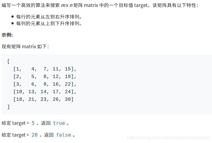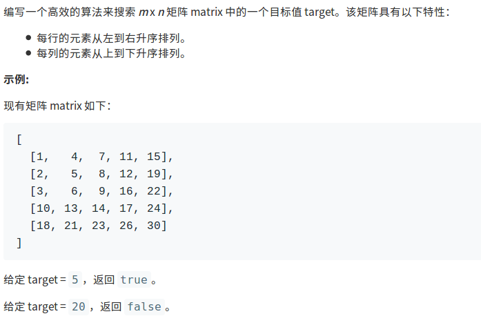class Solution { public: bool searchMatrix(vector<vector<int>>& matrix, int target) { if(matrix.empty() || matrix[0].empty()) return false; int row = matrix.size(); int startRow = 0, endRow = row - 1; while(startRow + 1 < endRow) { int mid = startRow + (endRow - startRow)/2; if(matrix[mid][0] == target) { return true; } else if(matrix[mid][0] < target) { startRow = mid; } else { endRow = mid; } } int selectRow = 0; if(matrix[endRow][0] <= target) { selectRow = endRow; } else { selectRow = startRow; } int startCol = 0, endCol = matrix[0].size() - 1; while(startCol+1 < endCol) { int mid = startCol + (endCol - startCol)/2; if(matrix[selectRow][mid] == target) { return true; } else if(matrix[selectRow][mid] < target) { startCol = mid; } else { endCol = mid; } } if(matrix[selectRow][startCol] == target || matrix[selectRow][endCol] == target) return true; return false; } }; 3.搜索二维矩阵 III(leetcod 240)