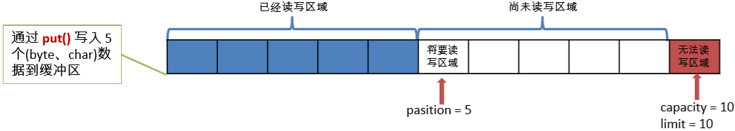 //2. 利用 put() 存入数据到缓冲区中 ---> 5、10、10 buf.put(str.getBytes()); System.out.println(buf.position() + buf.limit() + buf.capacity());