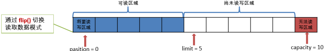 | Buffer flip() | 将缓冲区的界限设置为当前位置,并将当前位置充值为 0 |
