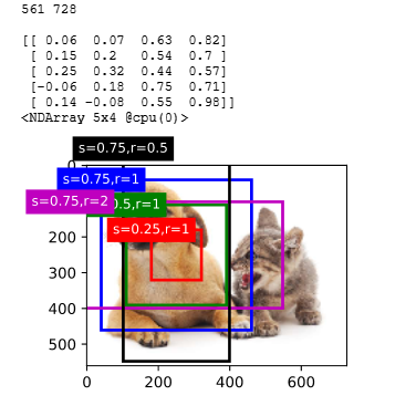 from mxnet import image,contrib,gluon,nd import numpy as np import d2lzh as d2l np.set_printoptions(2) img = image.imread('img/catdog.jpg').asnumpy() h,w = img.shape[0:2] #高和宽 print(h,w) X = nd.random.uniform(shape=(1,3,h,w)) Y = contrib.nd.MultiBoxPrior(X,sizes=[0.75,0.5,0.25],ratios=[1,2,0.5]) # 一个像素5个锚框 Y.shape #(1,2042040,4) boxes = Y.reshape((h,w,5,4)) print(boxes[250,250,:,:]) def show_bboxes(axes,bboxes,labels=None,colors=None): def _make_list(obj,default_values=None): if obj is None: obj = default_values elif not isinstance(obj,(list,tuple)): obj = [obj] return obj labels = _make_list(labels) #['s=0.75,r=1', 's=0.5,r=1', 's=0.25,r=1', 's=0.75,r=2', 's=0.75,r=0.5'] colors = _make_list(colors,['b','g','r','m','c']) #['b', 'g', 'r', 'm', 'c'] for i,bbox in enumerate(bboxes): color = colors[i%len(colors)] rect = d2l.bbox_to_rect(bbox.asnumpy(),color) axes.add_patch(rect) print(i) if labels and len(labels)>i: #个数判定 text_color = 'k' if color == 'w' else 'w' # 因为是颜色,w是白色 #增加外框,如文字说名. axes.text(rect.xy[0],rect.xy[1],labels[i],va='center',ha='center', fontsize=9,color=text_color,bbox=dict(facecolor=color,lw=0)) d2l.set_figsize() bbox_scale = nd.array((w,h,w,h)) fig = d2l.plt.imshow(img) # 因为x轴和y轴坐标除了宽和高,这里需要还原. show_bboxes(fig.axes,boxes[250,250,:,:]*bbox_scale,['s=0.75,r=1','s=0.5,r=1', 's=0.25,r=1','s=0.75,r=2', 's=0.75,r=0.5']) d2l.plt.show()