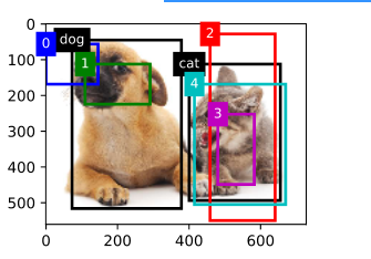 # 在上面的基础上,注释掉show_bboxes(fig.axes,boxes[250,250,:,:]*bbox_scale,['s=0.75,r=1','s=0.5,r=1', # 's=0.25,r=1','s=0.75,r=2', # 's=0.75,r=0.5']) #In[6] # 第一个元素是类别,0为狗,1为猫,剩下4个是锚框坐标 ground_truth = nd.array([[0,0.1,0.08,0.52,0.92],[1,0.55,0.2,0.9,0.88]]) # 其余5个锚框坐标 anchors = nd.array([[0,0.1,0.2,0.3],[0.15,0.2,0.4,0.4],[0.63,0.05,0.88,0.98],[0.66,0.45,0.8,0.8], [0.57,0.3,0.92,0.9]]) fig = d2l.plt.imshow(img) # k与5个锚框颜色区分。 show_bboxes(fig.axes,ground_truth[:,1:]*bbox_scale,['dog','cat'],'k') show_bboxes(fig.axes,anchors*bbox_scale,['0','1','2','3','4']) d2l.plt.show()