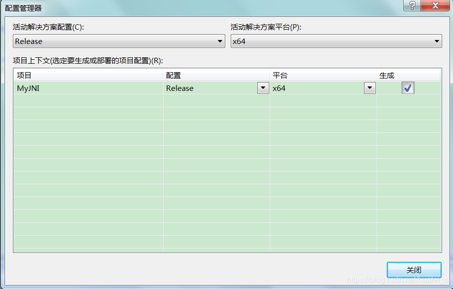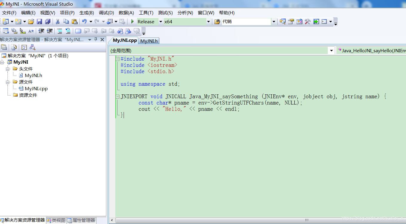 在方案名上点击右键,点击“生成解决方案”,生成MyJNI.dll,在\x64\Release下。