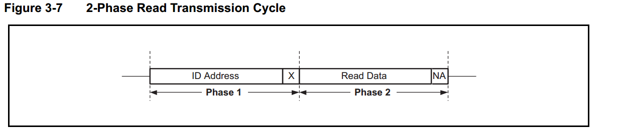 读操作由二相写操作和二相读操作构成,先进行二相写操作,向从机发送要读的寄存器地址,而后进行二相读操作,从机会把寄存器的值放在读操作的第二相中。二相写操作,其数据传输时序与三相写操作相同;二相读操作,所要注意的是,在读取数据后,主机要在第9个时钟低电平期间拉高数据线SIO_D,发送不应答信号NA。