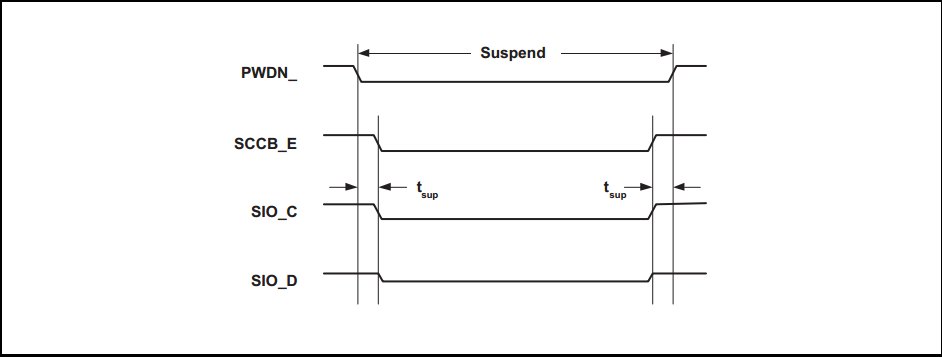 有的摄像头具有挂起模式功能,对于OV系列来说挂起功能由引脚PWDN控制,在主机将PWDN拉低,随后50ns将SCCB_E、SIO_D、SIO_C 三个拉低,从机进入挂起状态。之后的唤醒需要先拉高SCCB_E、SIO_D、SIO_C ,50ns之后拉高PWDN。