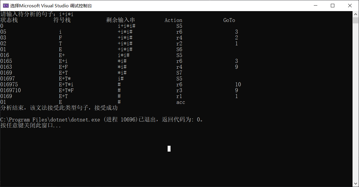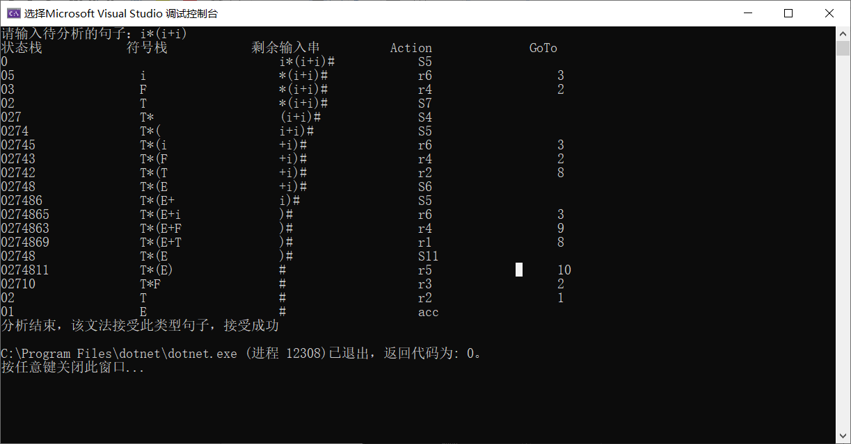 - Main函数:在while循环中,根据状态栈栈顶元素,输入字符串的首字符,查询Action表,根据其值判断分析是否结束。未结束,则分为成功,移进,规约三种状态进行分析。