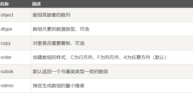 创建一个 ndarray 只需调用 NumPy 的array 函数即可:numpy.array(object, dtype = None, copy = True, order = None, subok = False, ndmin = 0)