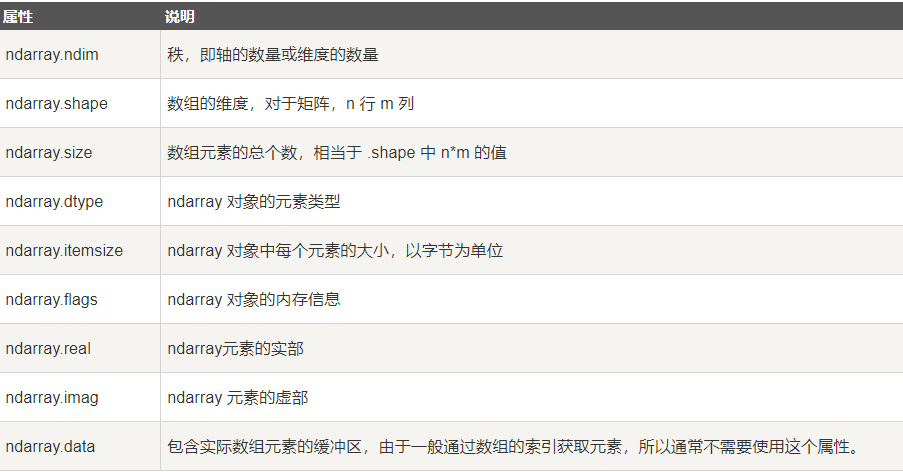 ndarray属性:ndim属性,表示维度个数;shape属性,表示各维度大小;dtype属性,表示数据类型。