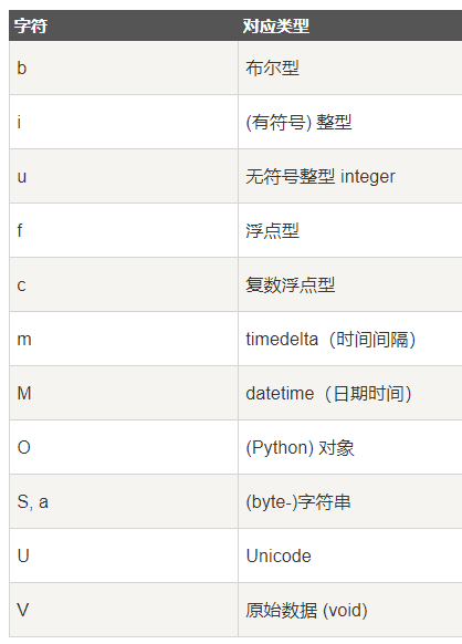 import numpy as np student = np.dtype([('name','S20'), ('age', 'i1'), ('marks', 'f4')]) print(student) # [('name', 'S20'), ('age', 'i1'), ('marks', '<f4')] import numpy as np student = np.dtype([('name','S20'), ('age', 'i1'), ('marks', 'f4')]) a = np.array([('abc', 21, 50),('xyz', 18, 75)], dtype = student) print(a) #[(b'abc', 21, 50.) (b'xyz', 18, 75.)] 每个内建类型都有一个唯一定义它的字符代码,如下: