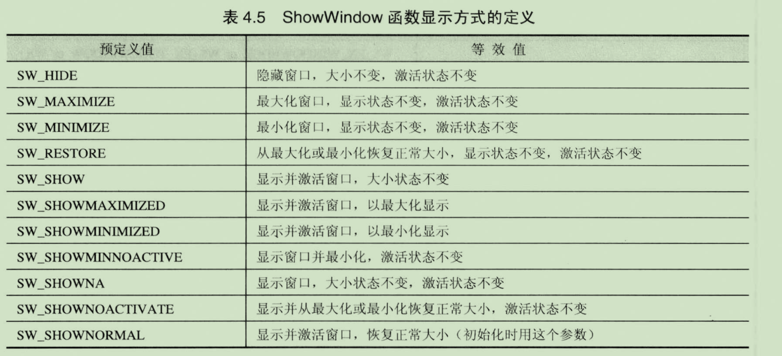 建立窗口后,eax中传回来的是窗口句柄,要把它保存起来以后备用,然后要用ShowWindow把它显示出来,ShowWindow用窗口句柄做第一个参数,第二个参数则是显示方式。