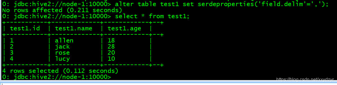 命令:alter table test1 set serdeproperties('field.delim'=',');