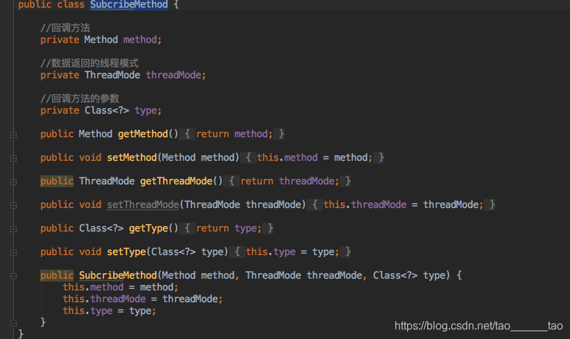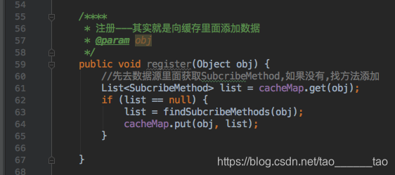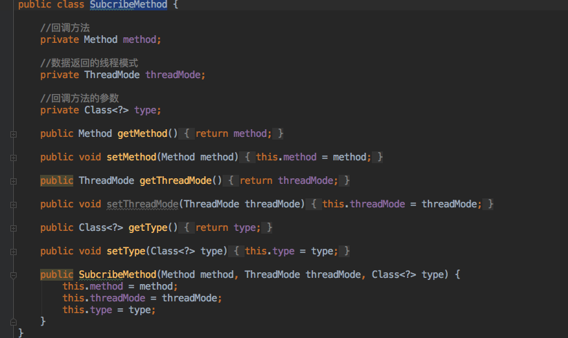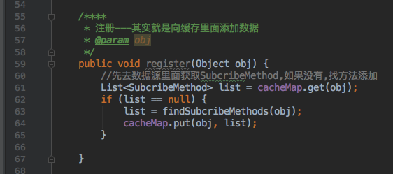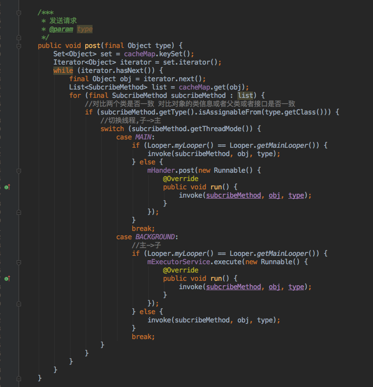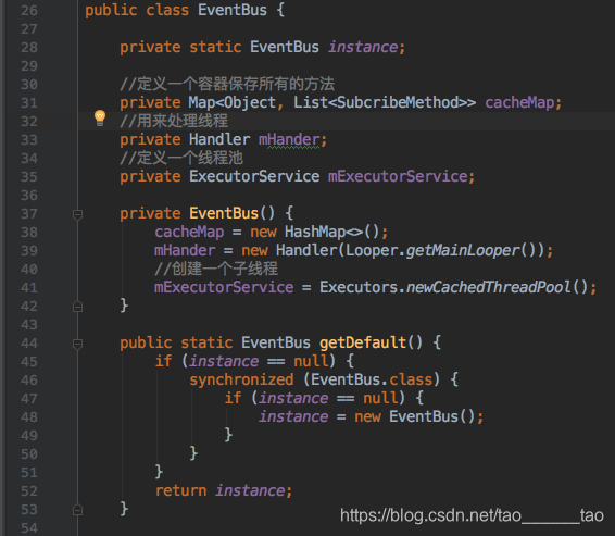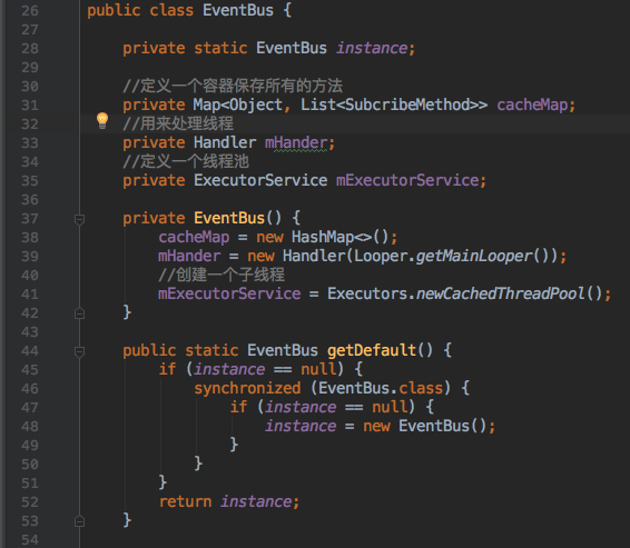 cacheMap ----如备注写的,是用来存储所有的方法 EventBus是事件对应的一一对应,这里用的是map,key是Object这个毋庸置疑,定义的事件可以是string int,也可以是自定义bean;value:是个集合,里面是之前定义的SubcribeMethod包含的内容下面会讲到 mHander -----处理线程,用子线程切换到主线程 mExecutorService -----用来处理主线程切换到子线程