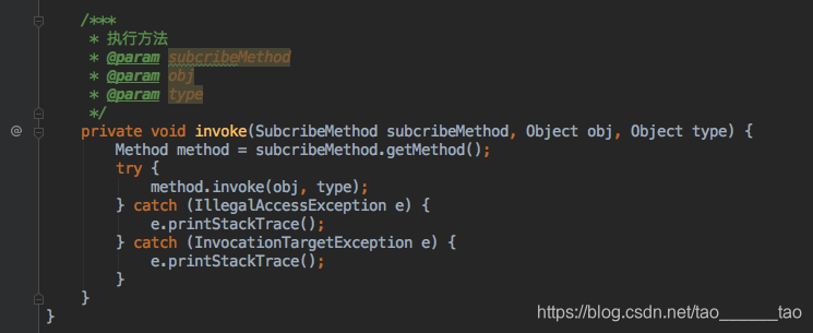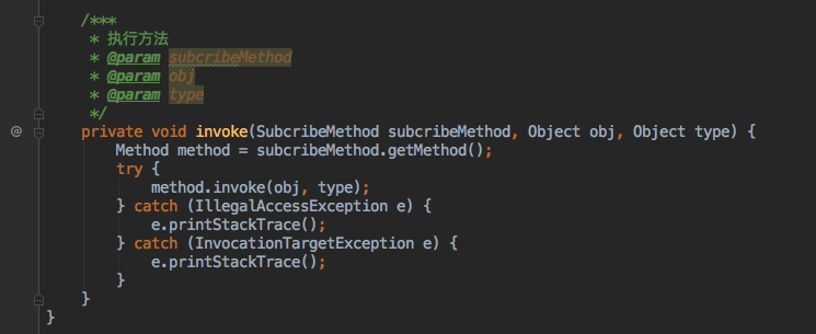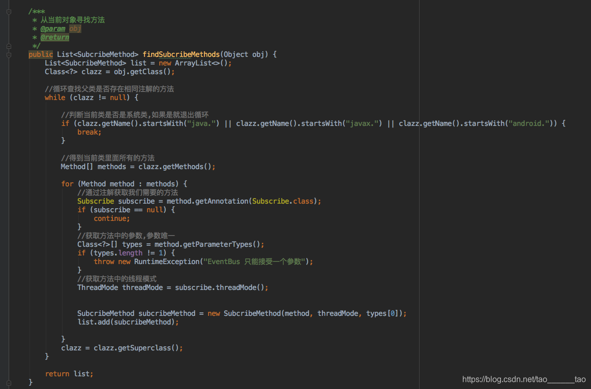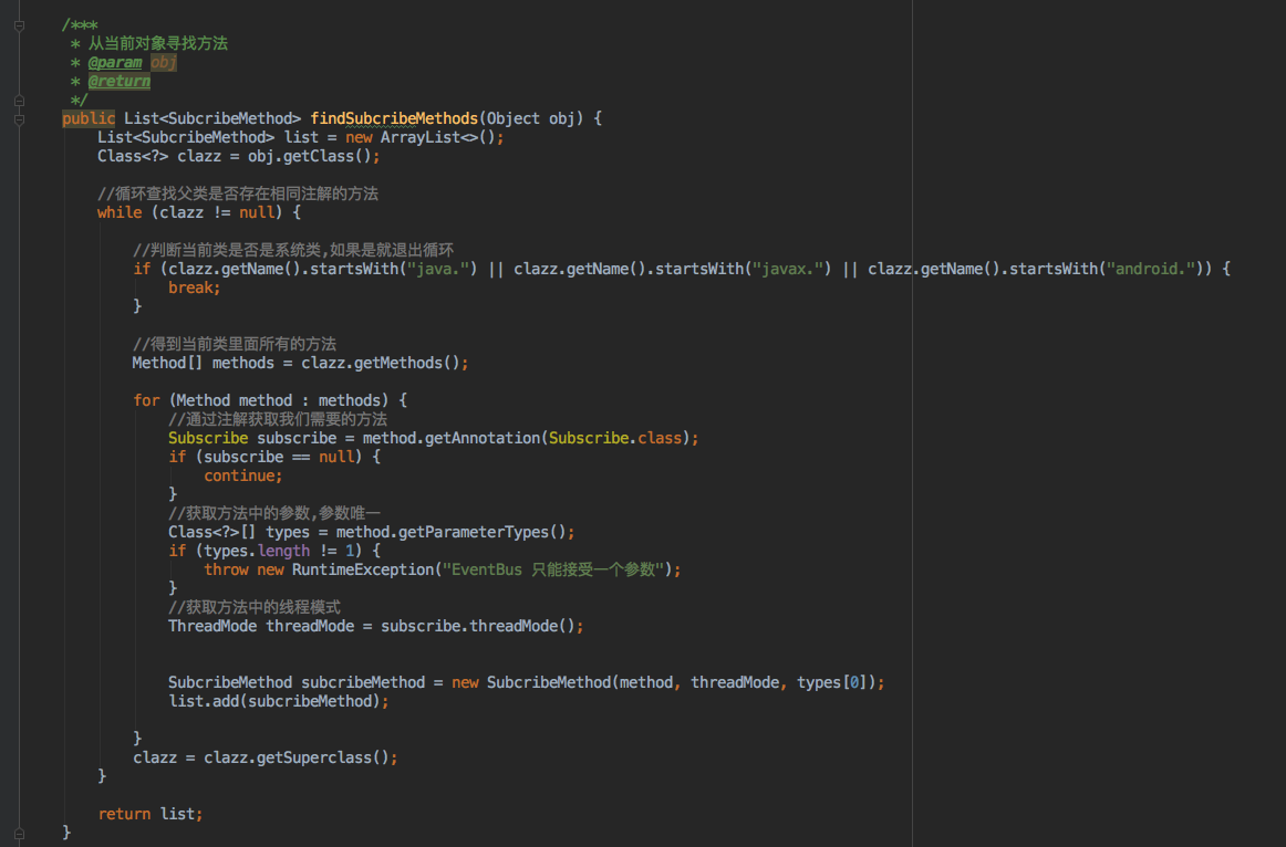 findSubcribeMethods这个方法是干嘛的,大家应该很疑惑,上面我们定义了一个map,这里就是根据map的key来存我们的事件,通过反射来找项目所有的,当然除了java.javax.android.这些系统的方法,具体实现,可以看下面,都有注释,方便大家理解