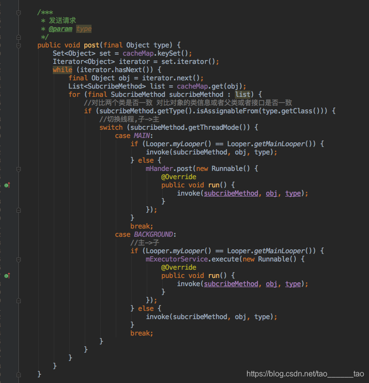 这个就是大家用到的post方法,从cacheMap里面去我们注册的类里面找对应的方法,这里就用到了handle和ExecutorService来做主线程和子线程的转换;