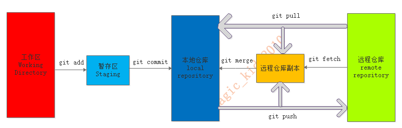 要理解它们的区别,首先我们需要明白的git的架构,它是分布式的版本管理系统。我画了张图,不仅仅涉及到 git fetch 和 git pull,