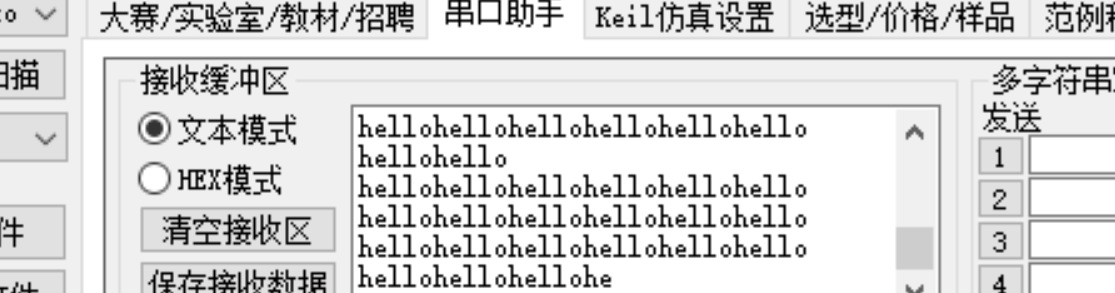 #include "uart.h" #include "stdio.h" #include "stm32f10x.h" //延时函数 void delay(void) { int i; int j; for(i=100;i>0;i--) { for(j=100;j>0;j--){ } } } int main(void ) { //初始化串口 init_uart(); //不断向串口发数据 while(1) { delay(); printf("hello\n"); } return 0; } 实验结果