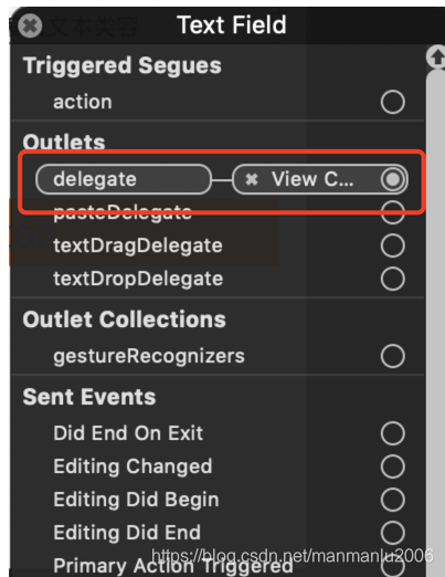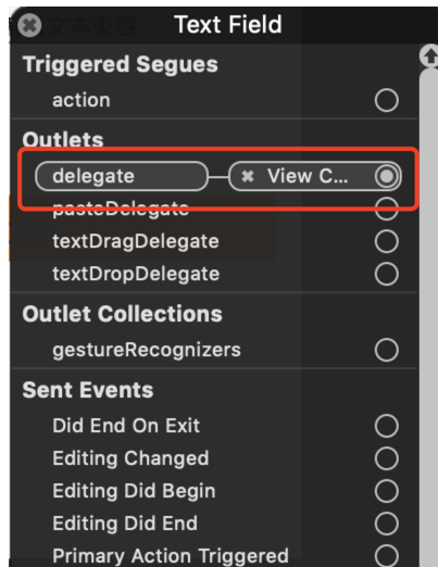 经过上面操作,弹出的选项对话框delegate选项后面的空心圆圈就变成实心了,如下图,表示delegate和View Controller建立了绑定关系