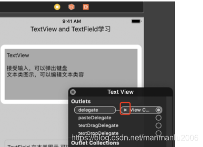 选中Main.storyboard中的TextView,mac触摸板双指点击弹出如下选择框,点击红色小框中的X,取消掉绑定关系