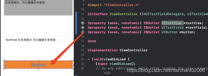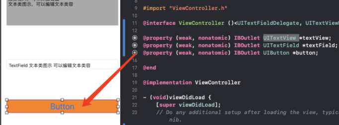 这句话需要跟故事板中的Button绑定起来,通过拖拽的连线的方式,选中上面添加的代码前的小圆点到故事板中的button视图,如下图: