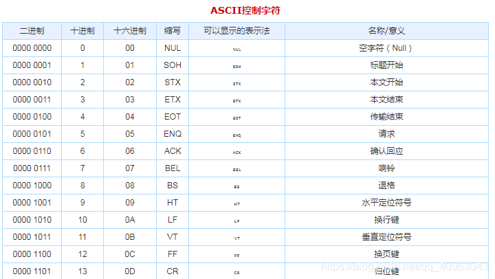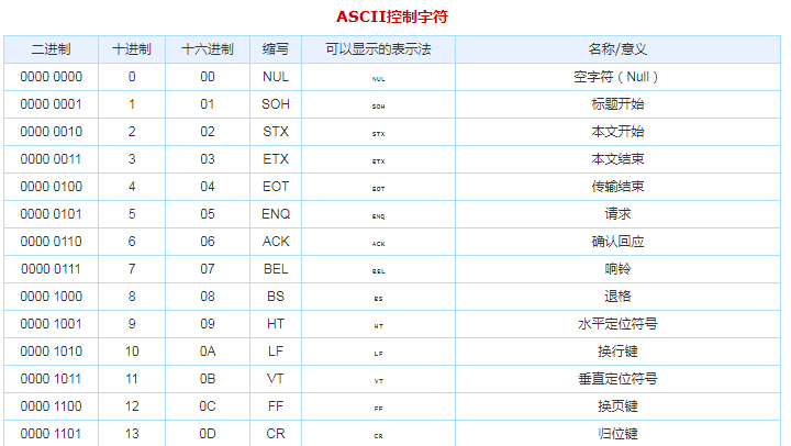 有点长,我就不全贴出来了(给个地址:http://ascii.911cha.com/?year=13),可以看到,都是一些控制字符串,非显示字符串,控制字符是用来实现特定操作的,如一些比较常用的控制字符就是ESC、BACKSPACE(删除上一个字符)、Del(删除当前字符)、回车符、换行符等。